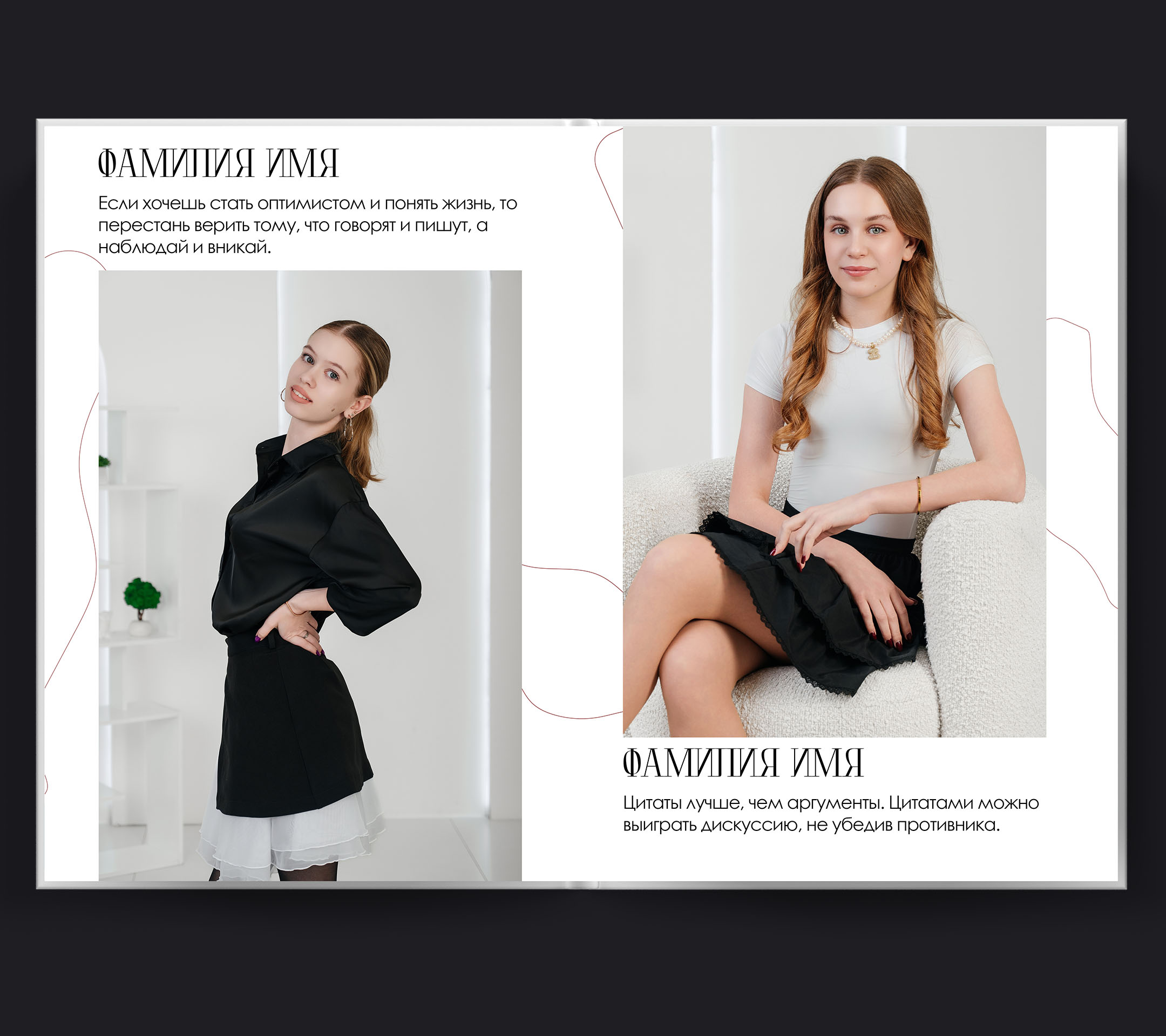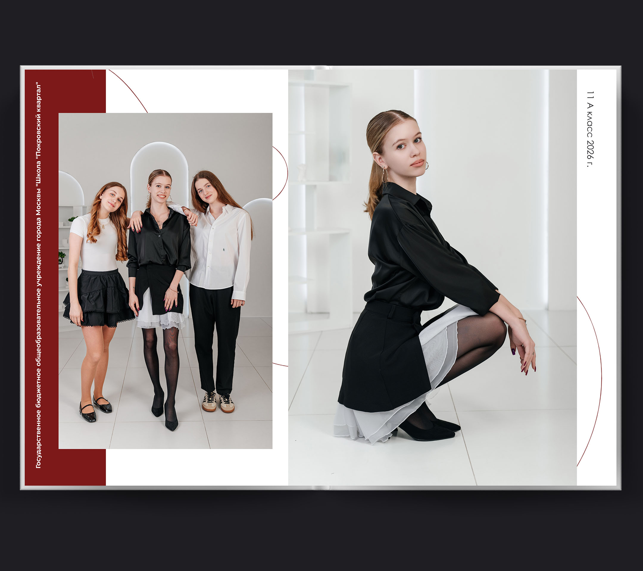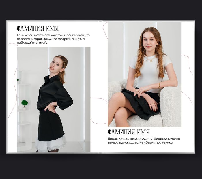 Забудьте о скучных школьных фотографиях! Aesthetics — это новый взгляд на выпускную съемку. Чистый фон, продуманные композиции и модные ракурсы делают каждый портрет произведением искусства. Белые страницы альбома создают идеальное полотно для ваших портретов — стильно, современно, без лишних деталей. Центр внимания — вы и ваша естественная красота.