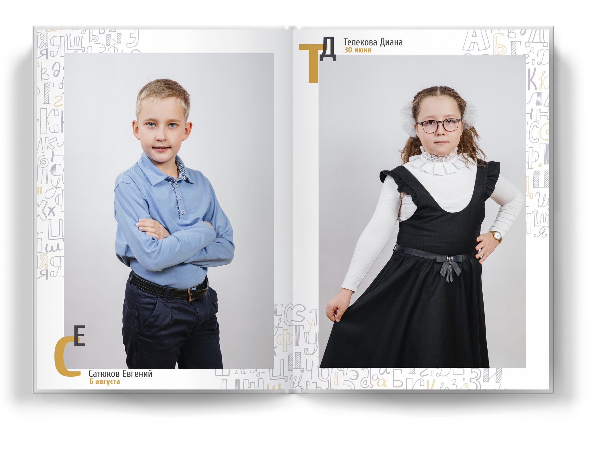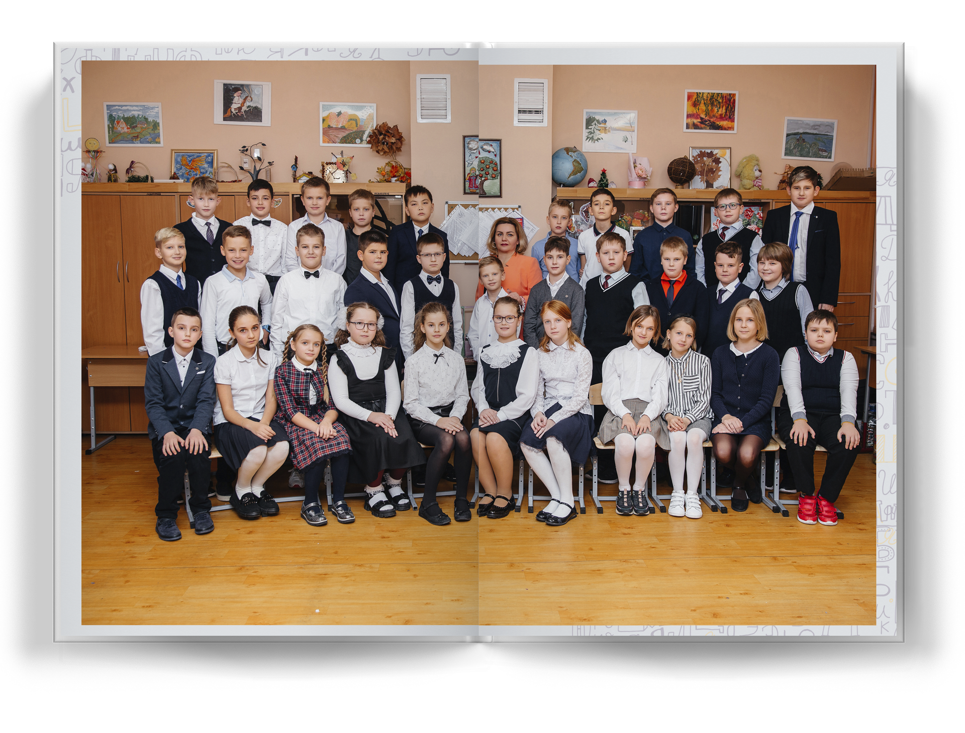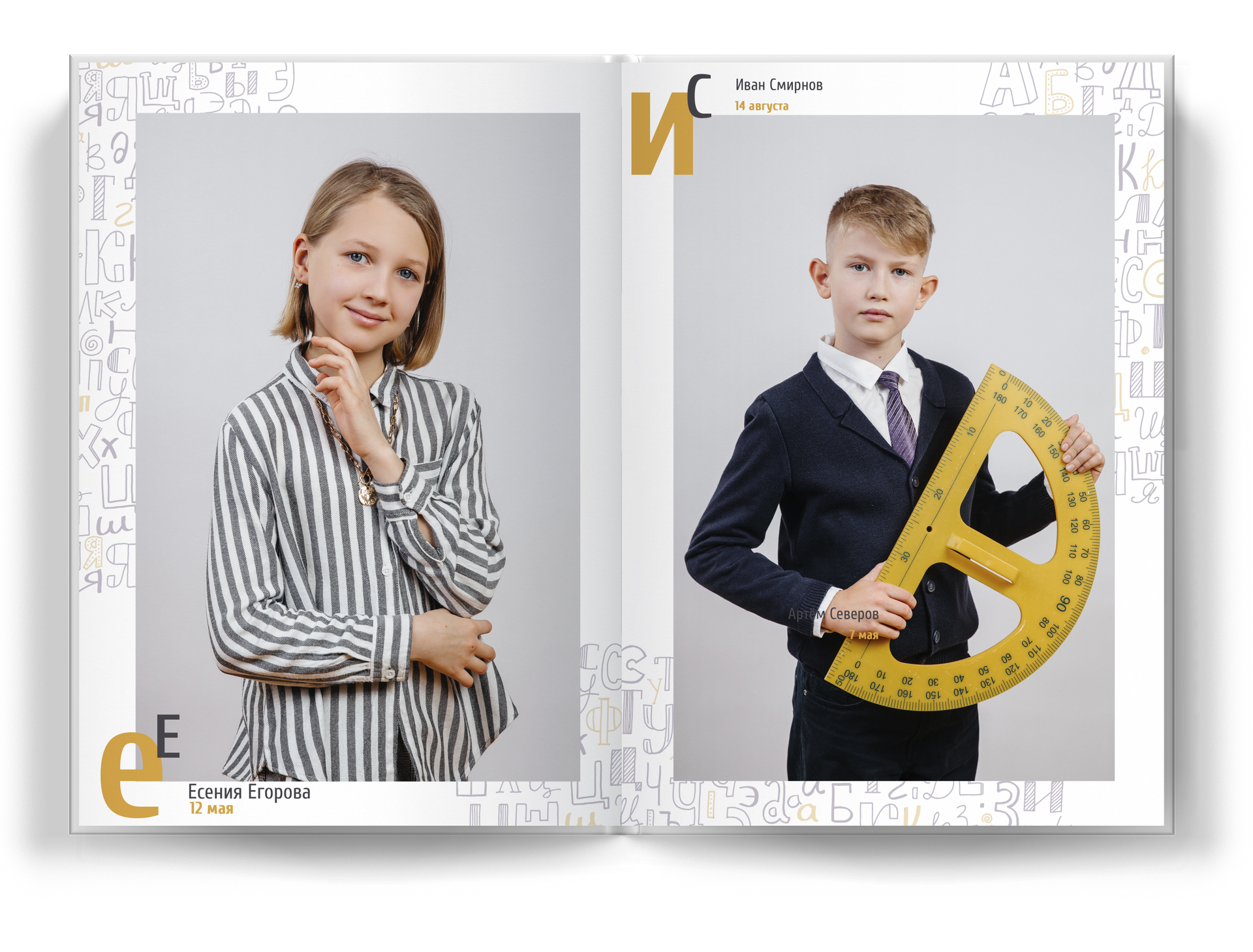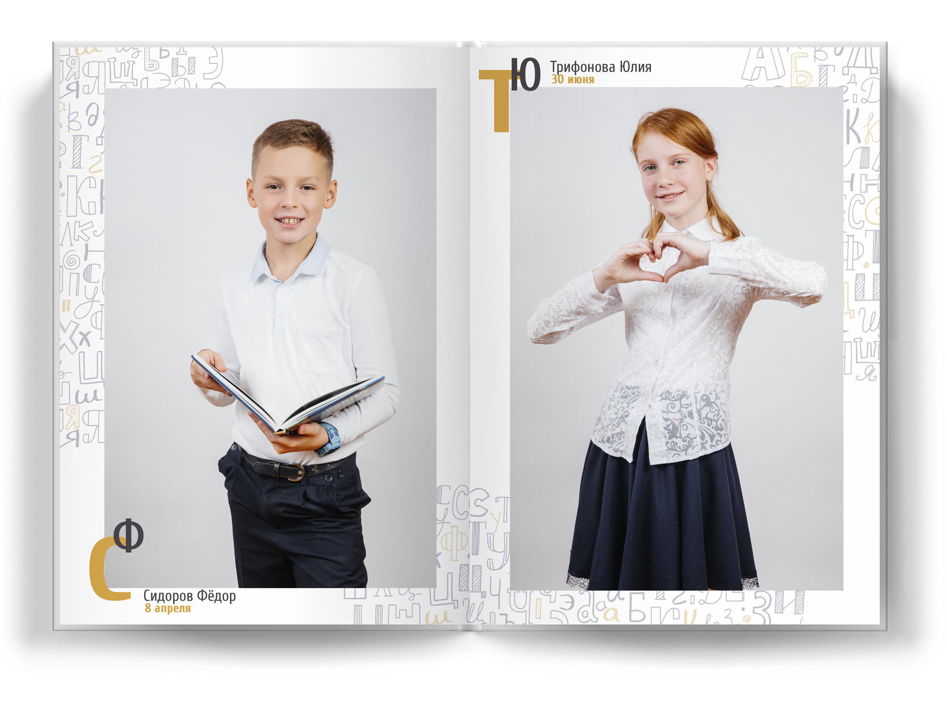 Наши фото на выпускной альбом 4 класса будут неординарными. Впрочем, как и сама история начального обучения вашего ребенка. Фотокнига «Алфавит» станет нечто большим, чем стандартным набором постановочных кадров. Вы получаете оригинальную по исполнению и жанровым задумкам реальную жизнь школьника в своем классе.
