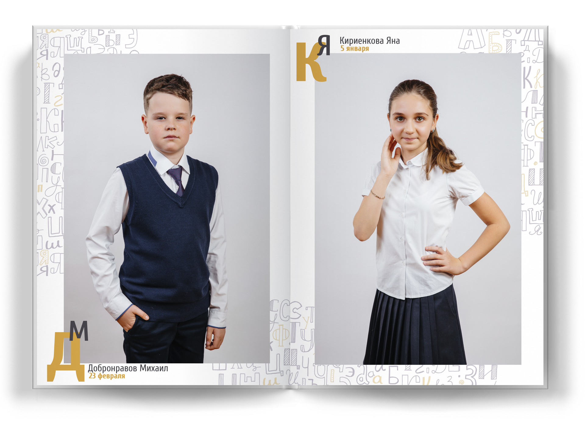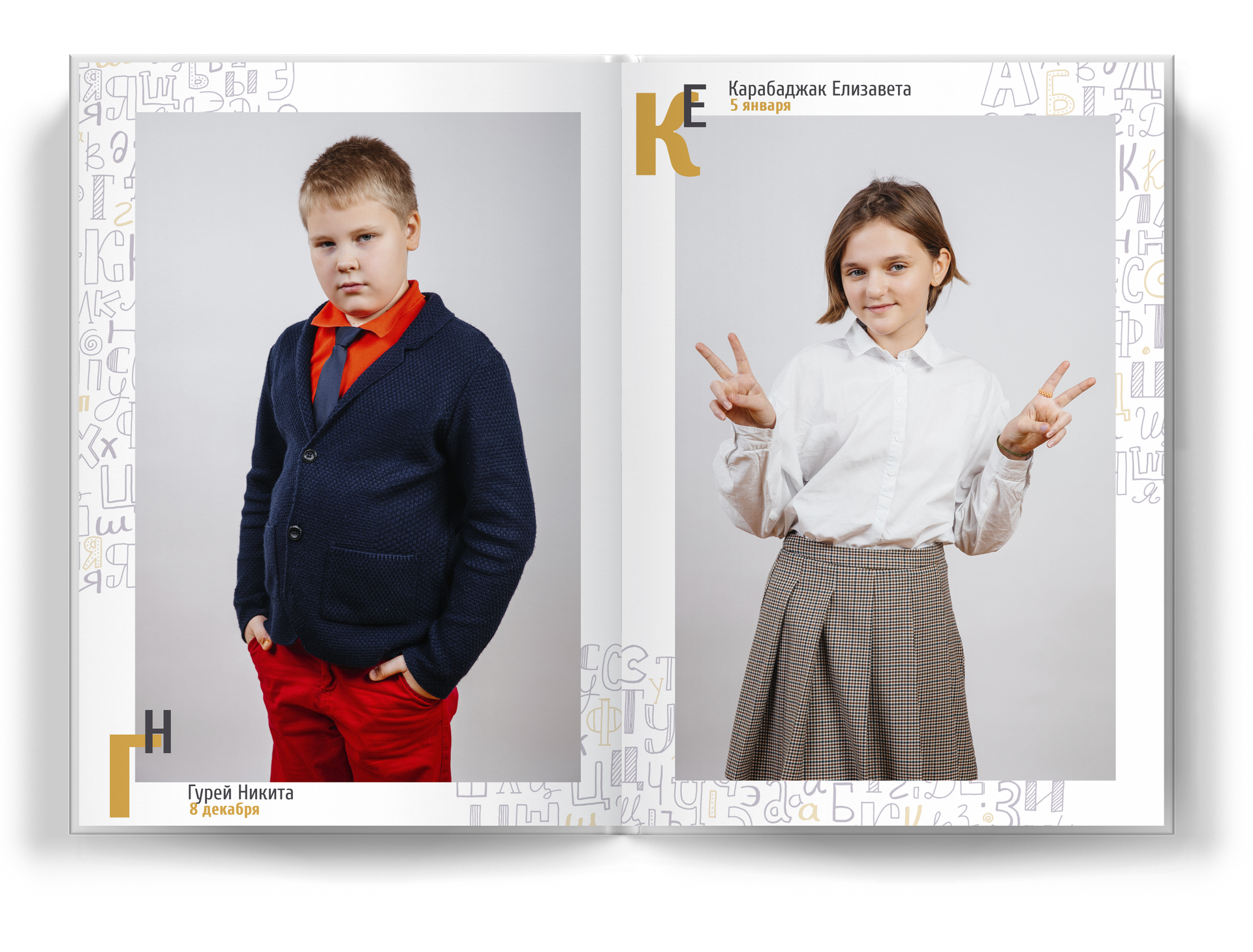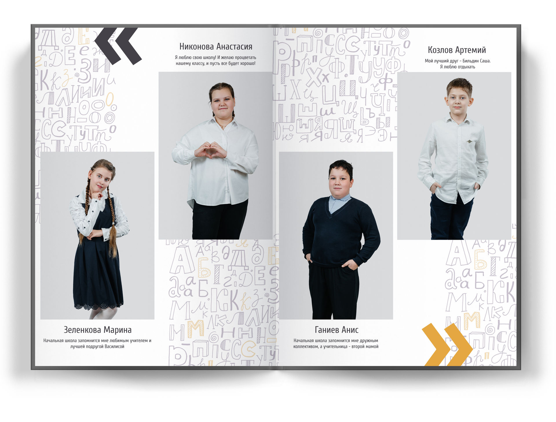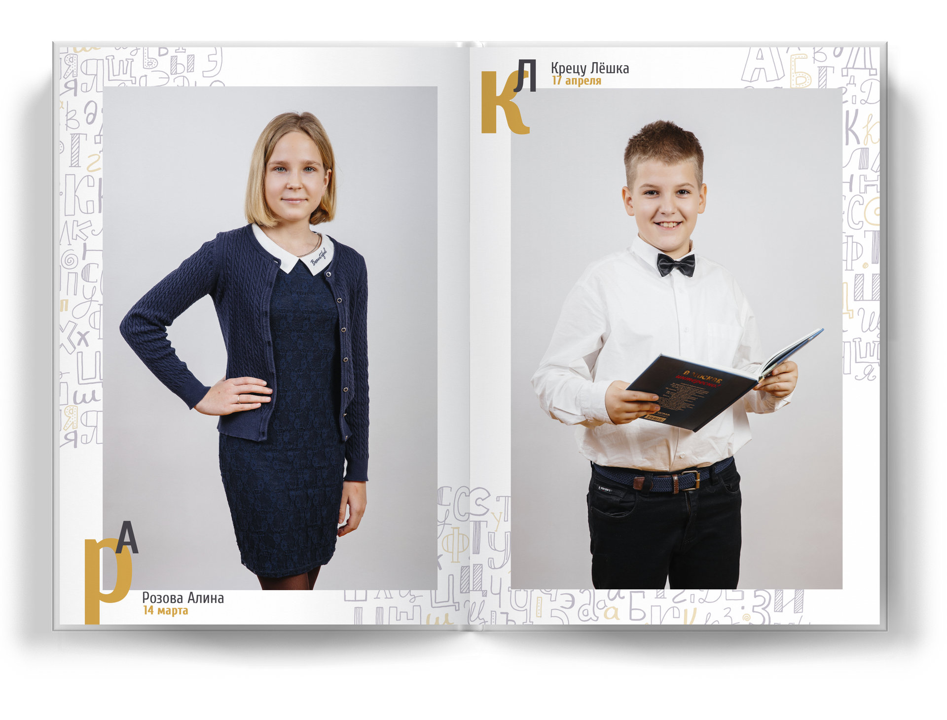 Наши фото на выпускной альбом 4 класса будут неординарными. Впрочем, как и сама история начального обучения вашего ребенка. Фотокнига «Алфавит» станет нечто большим, чем стандартным набором постановочных кадров. Вы получаете оригинальную по исполнению и жанровым задумкам реальную жизнь школьника в своем классе.