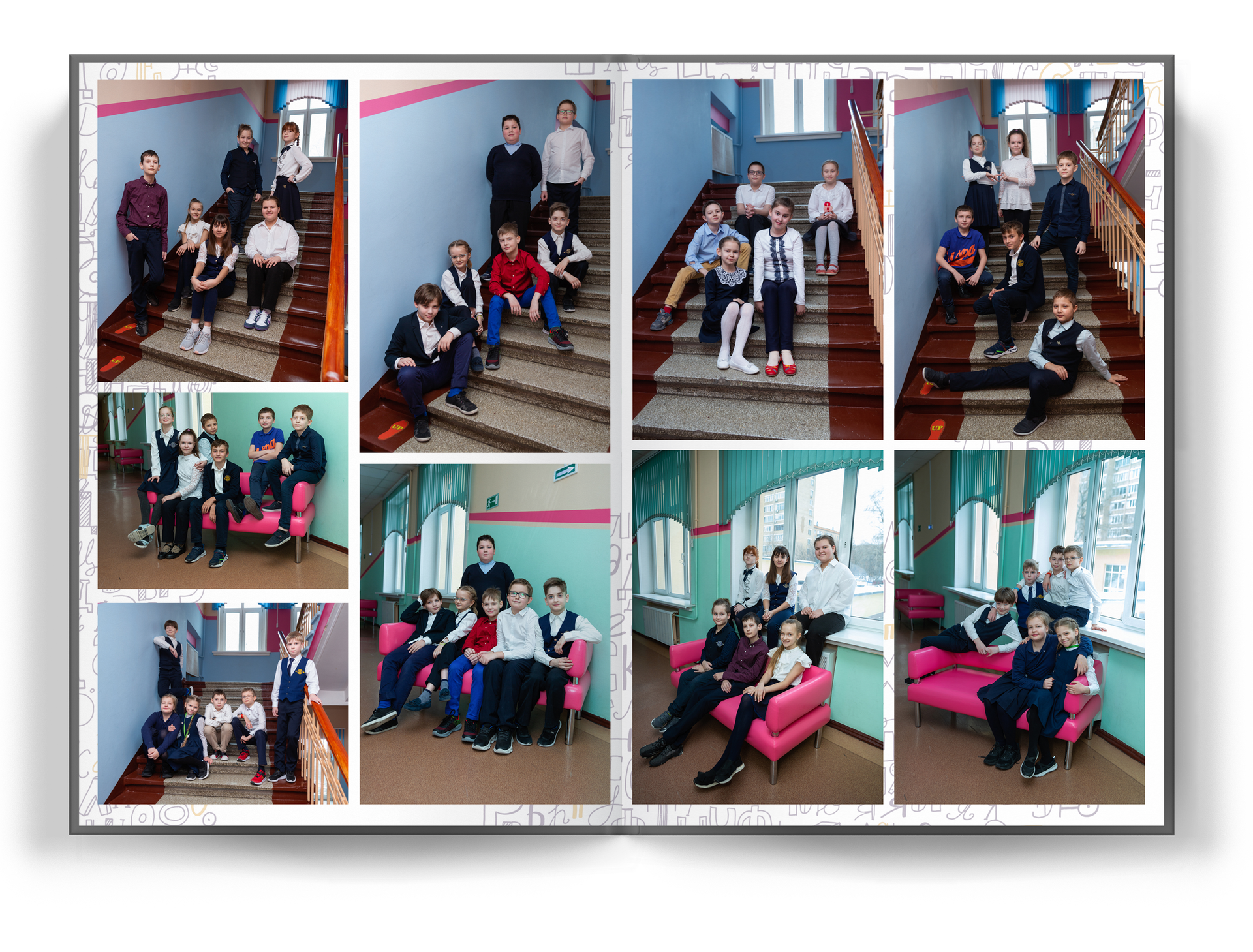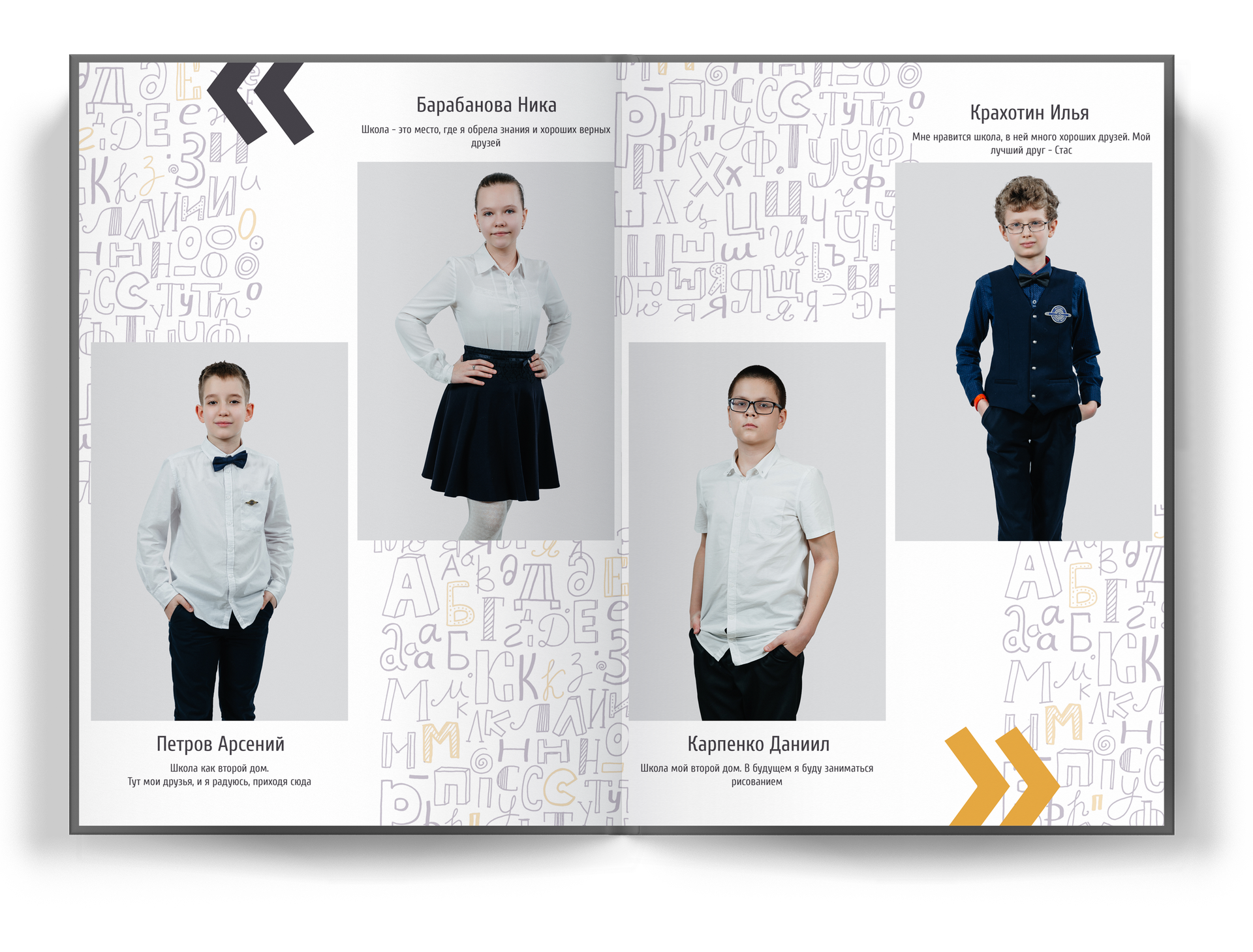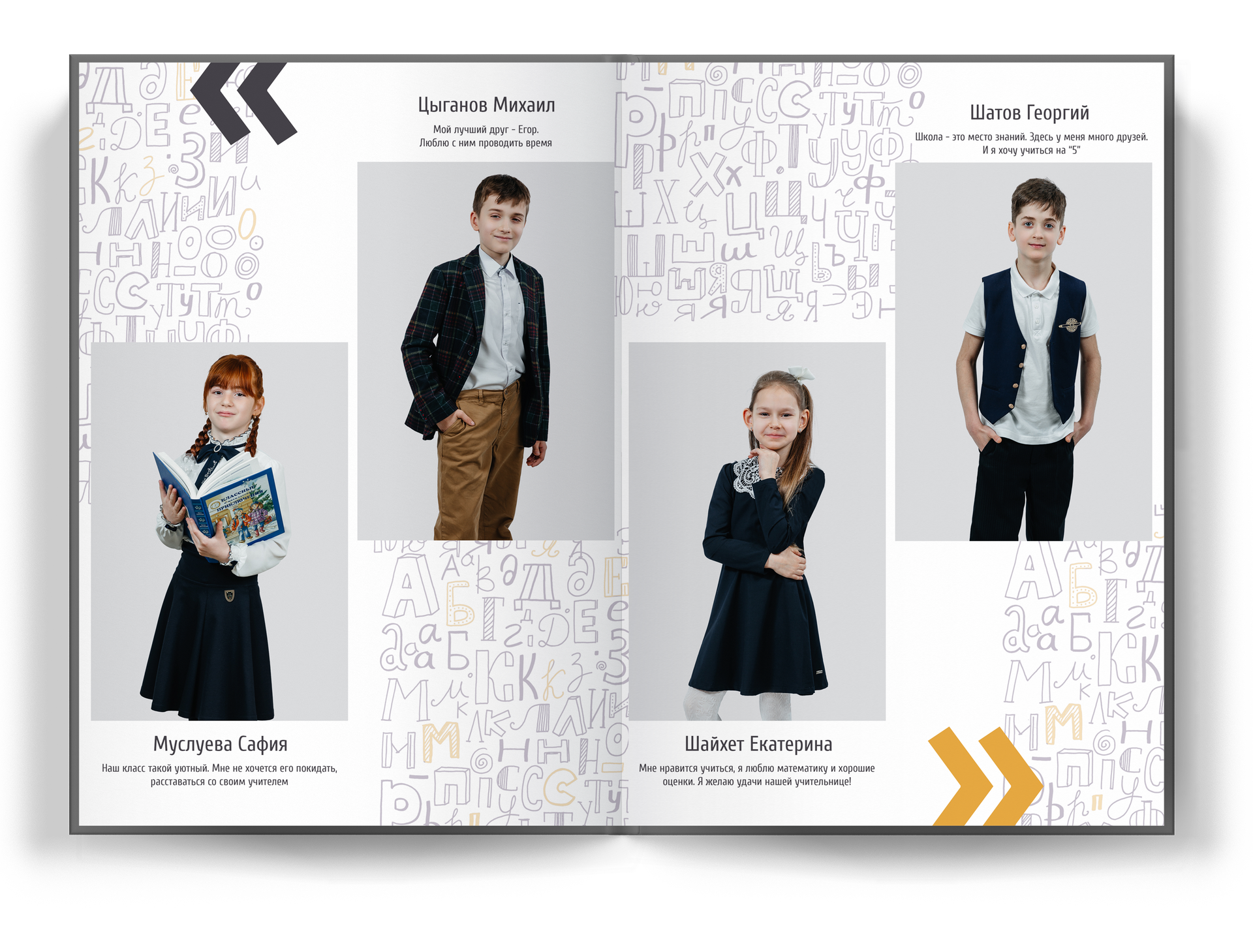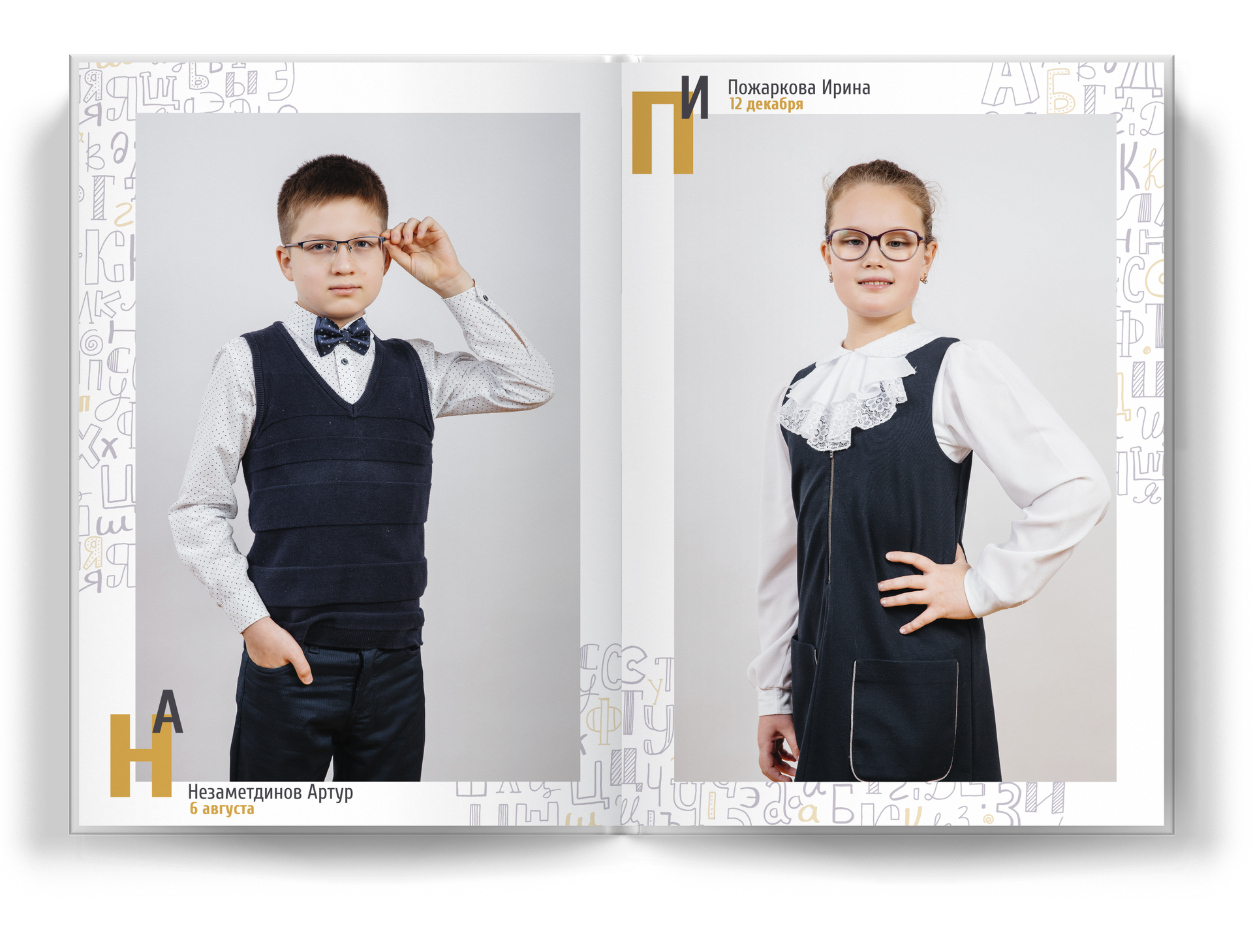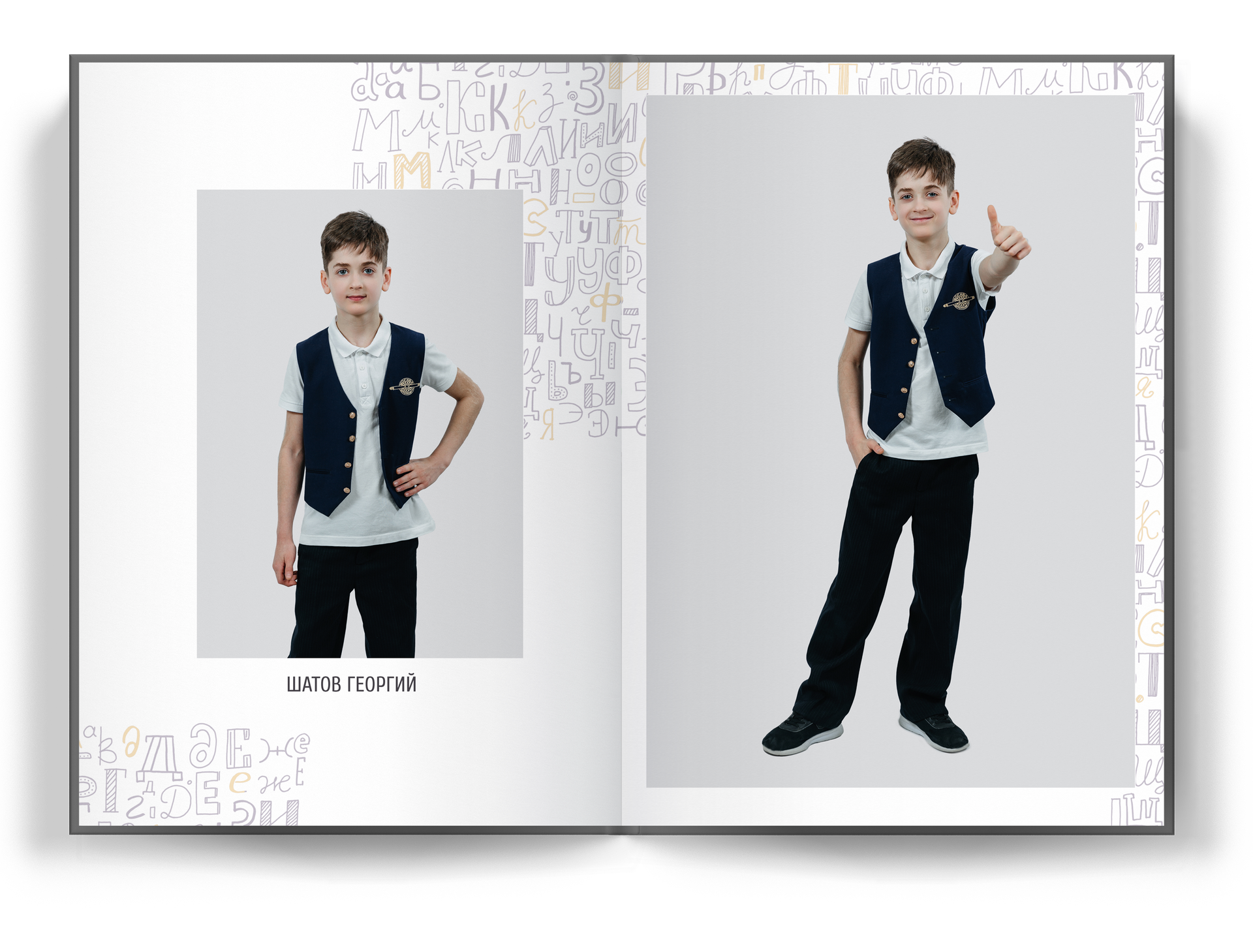 Наши фото на выпускной альбом 4 класса будут неординарными. Впрочем, как и сама история начального обучения вашего ребенка. Фотокнига «Алфавит» станет нечто большим, чем стандартным набором постановочных кадров. Вы получаете оригинальную по исполнению и жанровым задумкам реальную жизнь школьника в своем классе.
