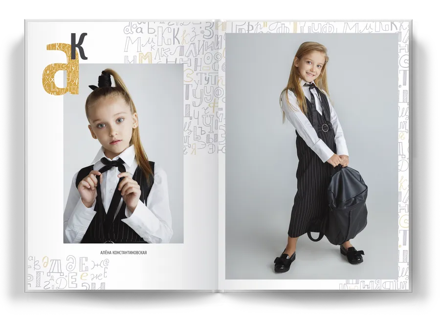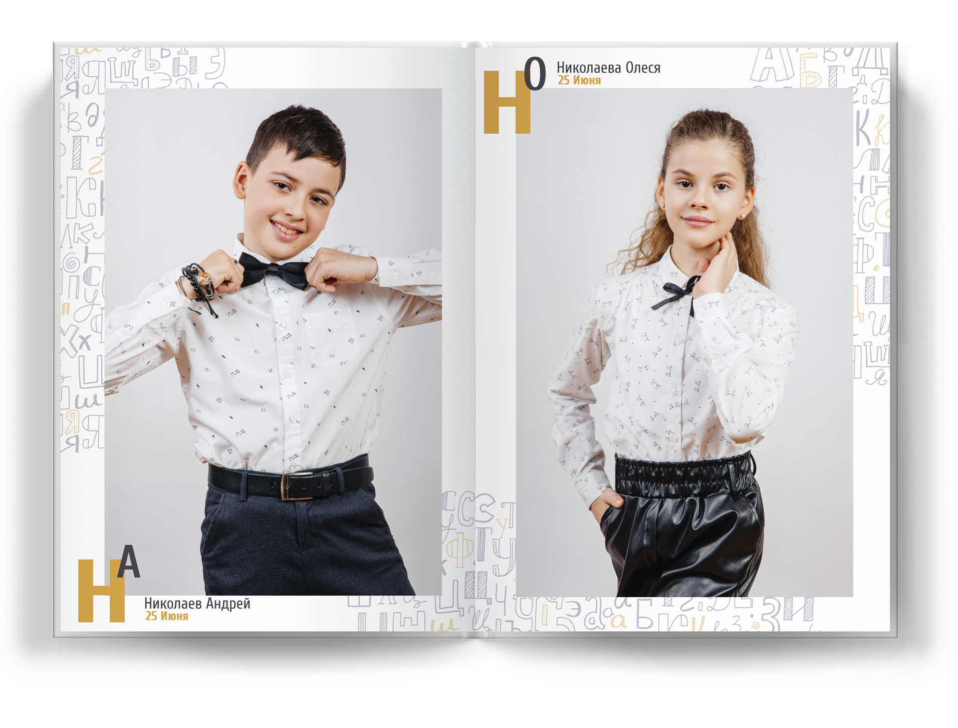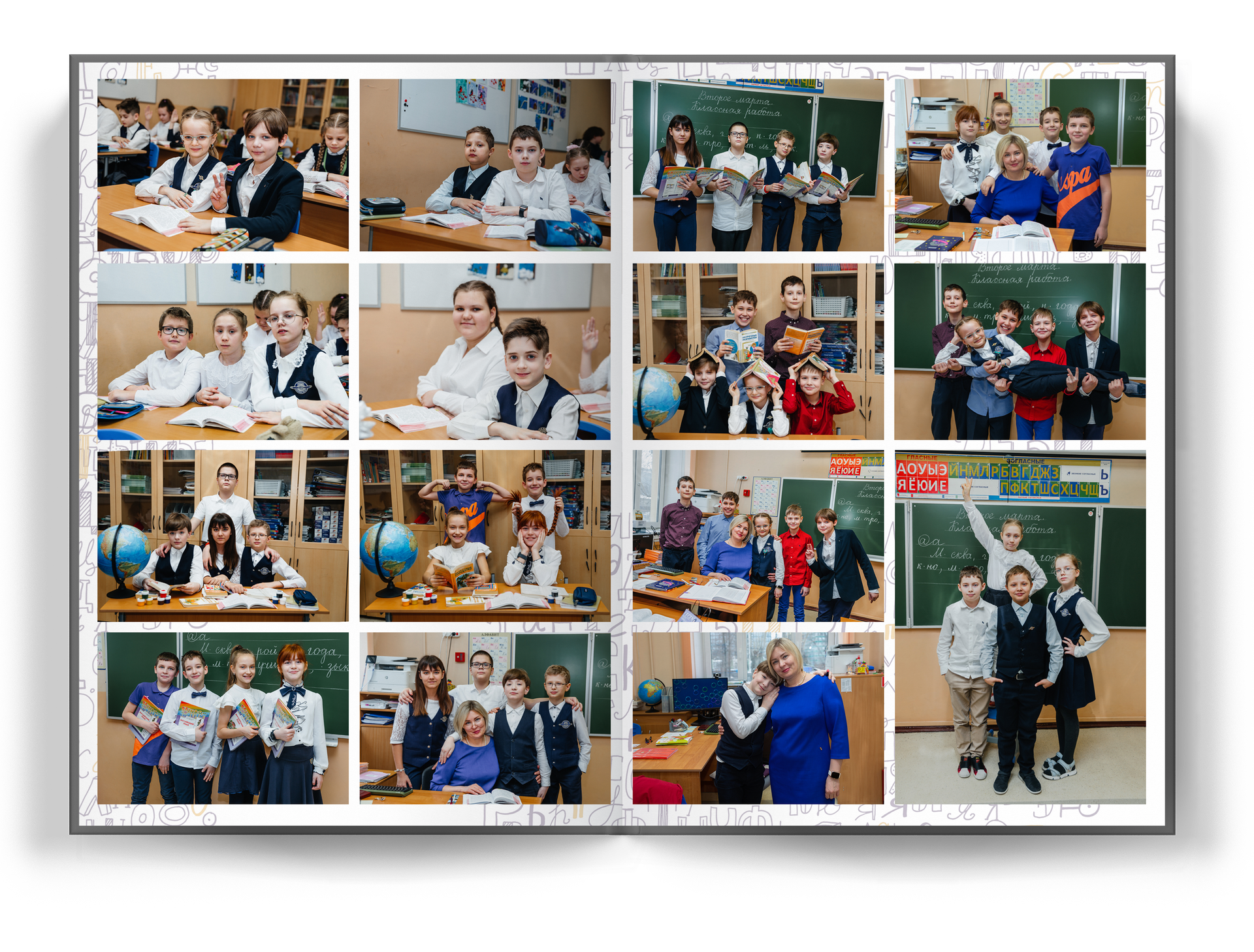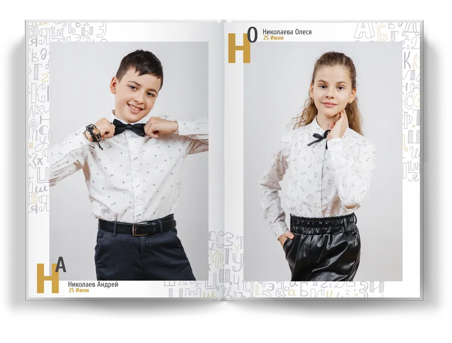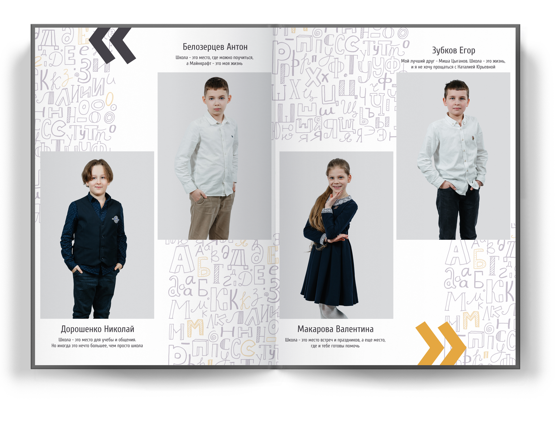Наши фото на выпускной альбом 4 класса будут неординарными. Впрочем, как и сама история начального обучения вашего ребенка. Фотокнига «Алфавит» станет нечто большим, чем стандартным набором постановочных кадров. Вы получаете оригинальную по исполнению и жанровым задумкам реальную жизнь школьника в своем классе.
