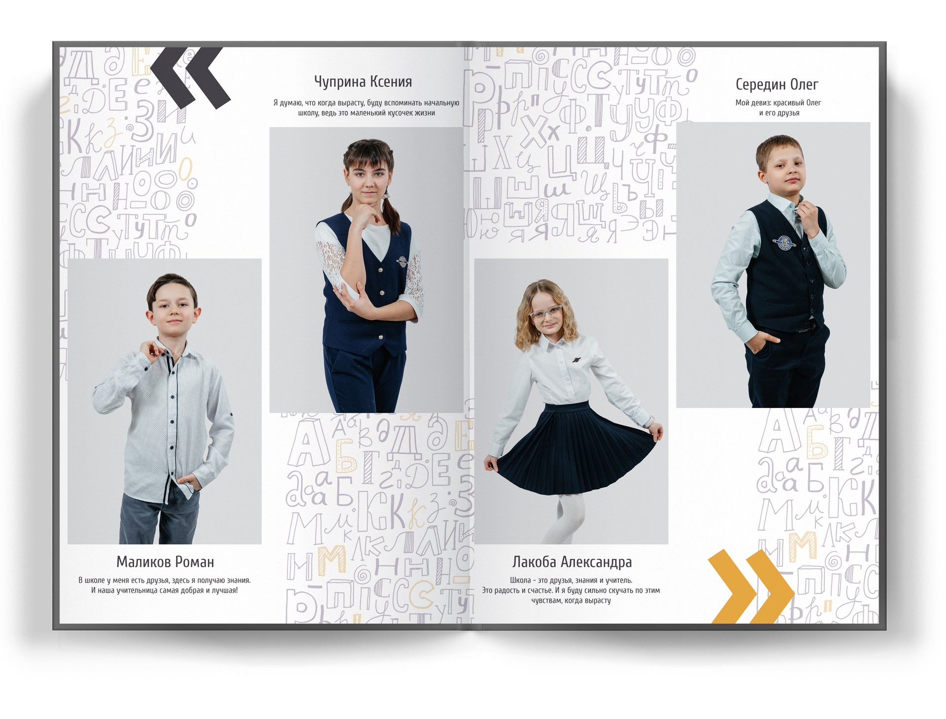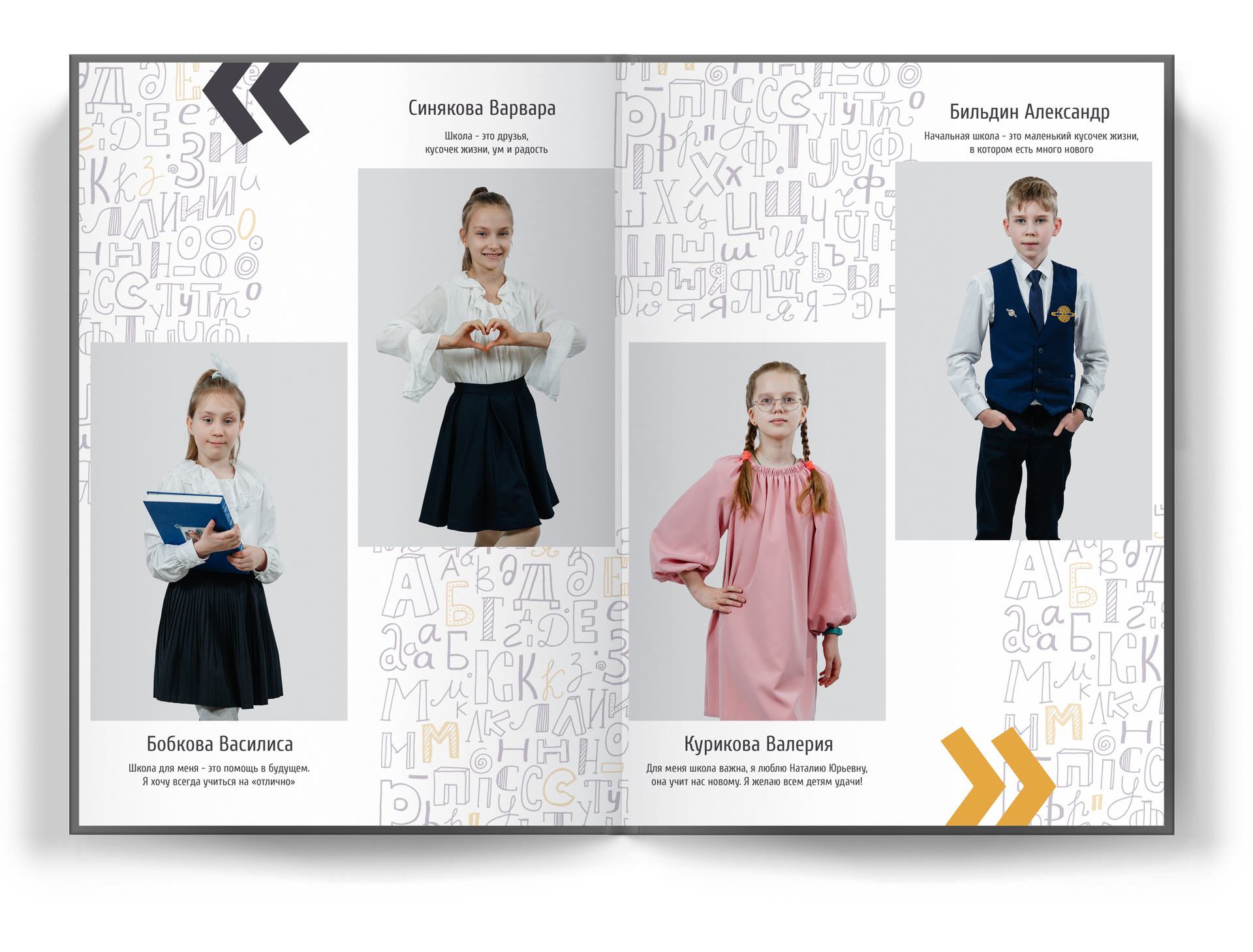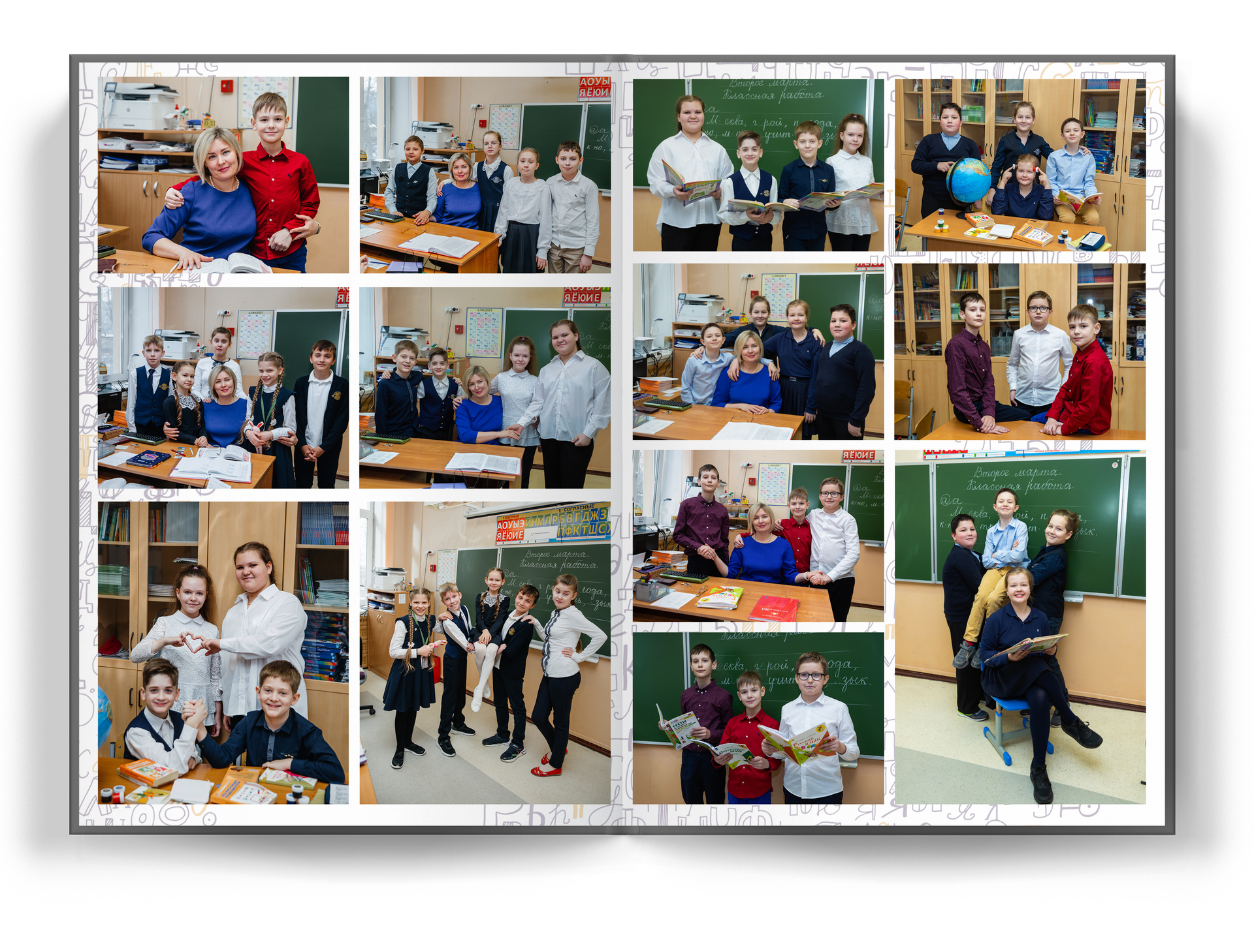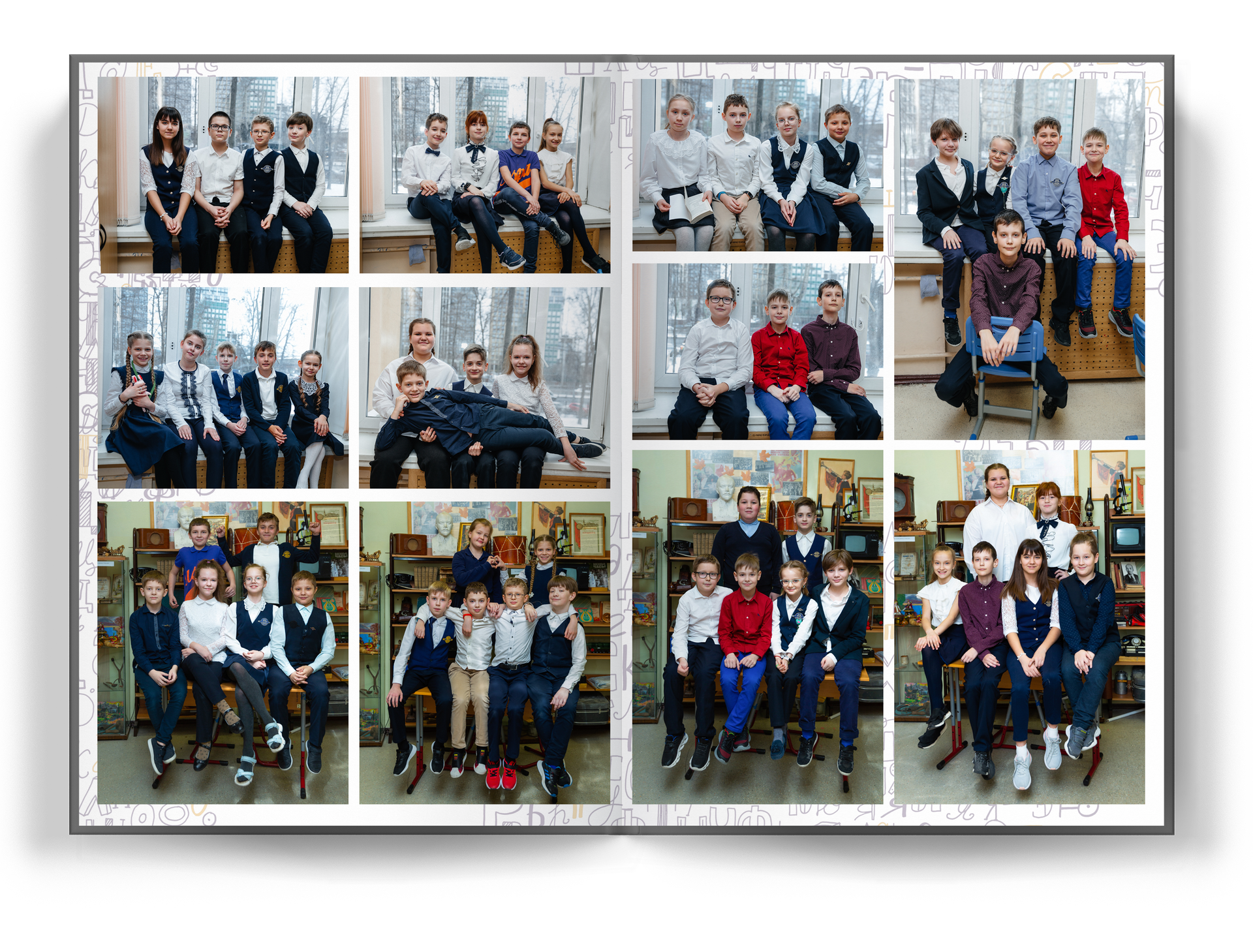 Наши фото на выпускной альбом 4 класса будут неординарными. Впрочем, как и сама история начального обучения вашего ребенка. Фотокнига «Алфавит» станет нечто большим, чем стандартным набором постановочных кадров. Вы получаете оригинальную по исполнению и жанровым задумкам реальную жизнь школьника в своем классе.